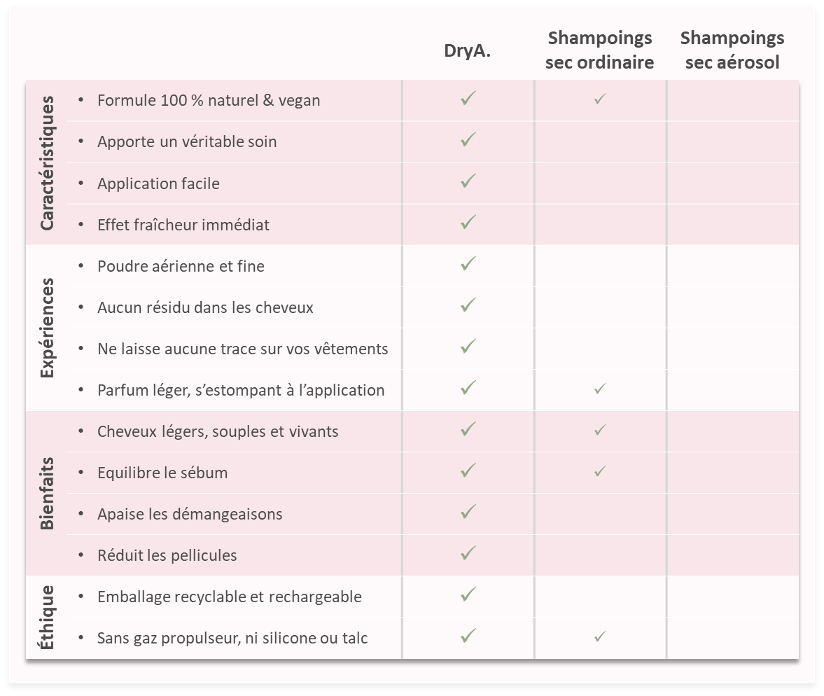 Pensé comme un shampoing sec, DryA. nettoie en douceur tout en prenant soin du cuir chevelu.